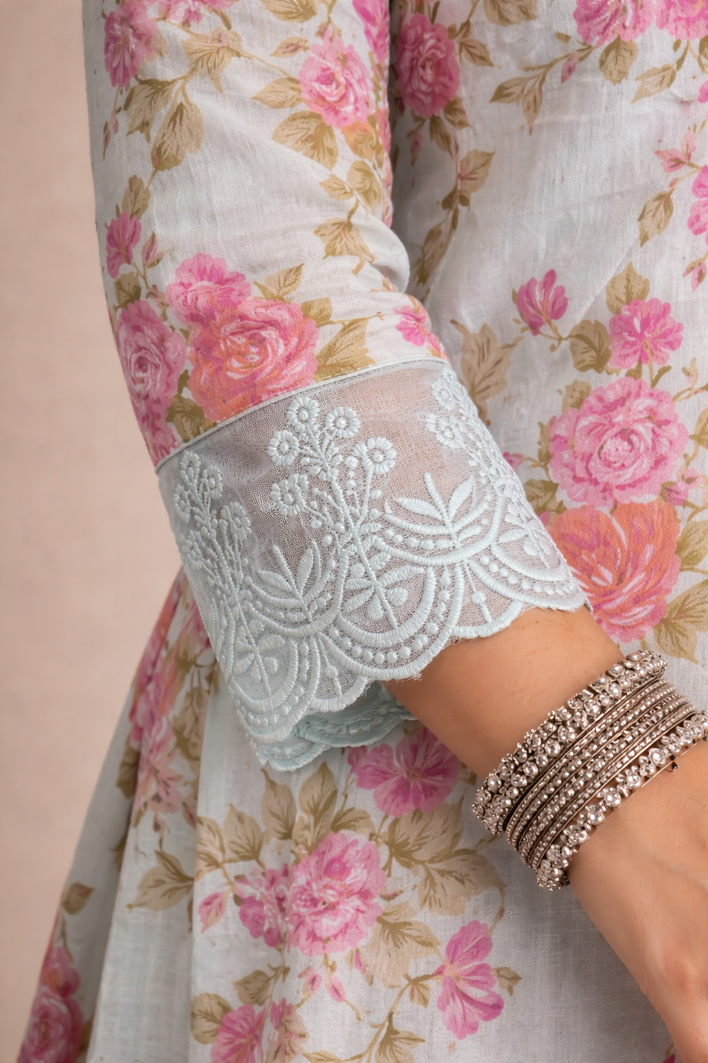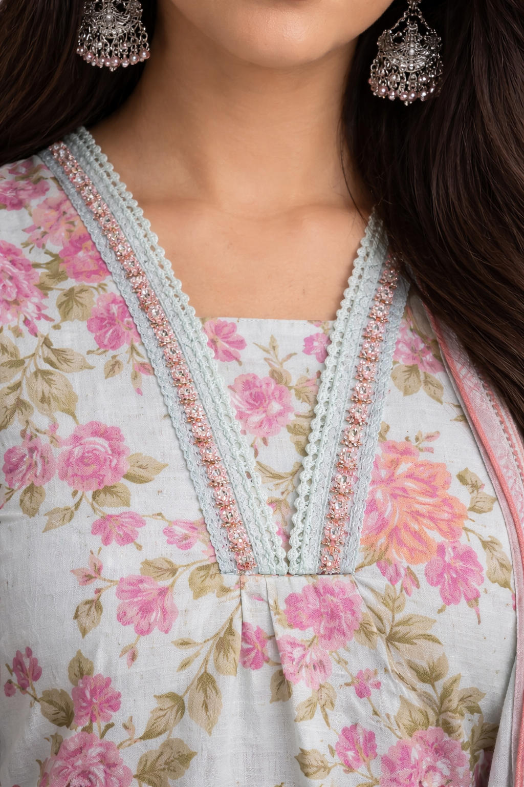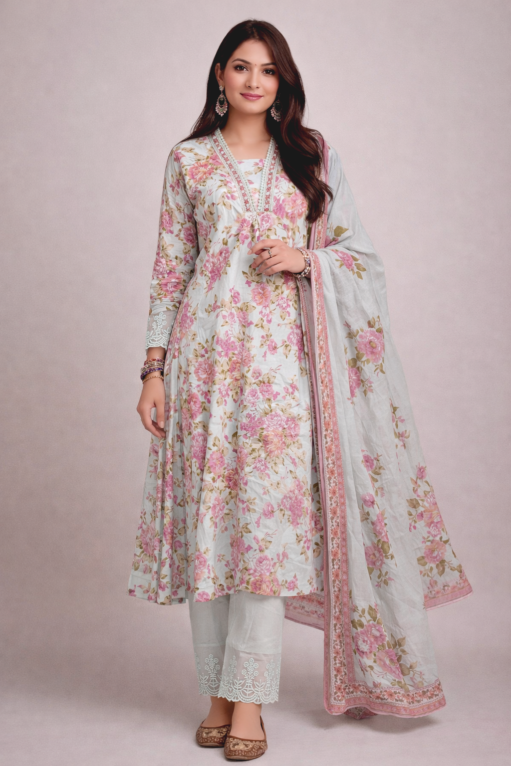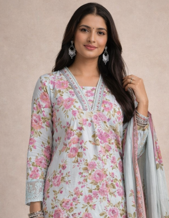 Embrace effortless elegance with this beautifully crafted pastel floral kurta set, designed to bring a soft feminine charm to your everyday and festive wardrobe. The soothing mint base adorned with delicate pink floral prints creates a refreshing and graceful look that is perfect for daytime gatherings, festive brunches, and casual celebrations.