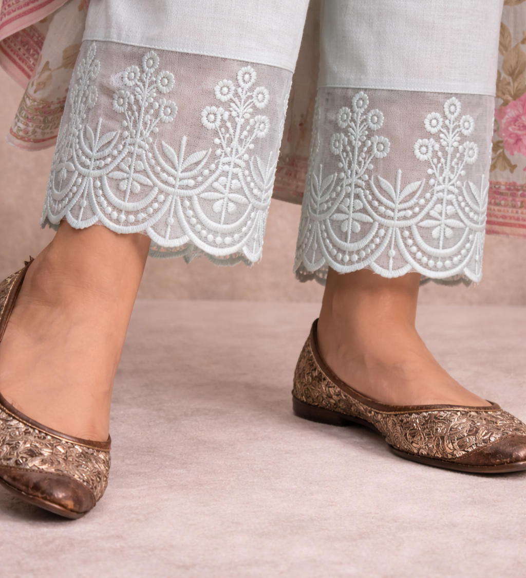 Paired with straight-fit pants featuring embroidered lace hems, the ensemble is completed with a lightweight matching dupatta that showcases coordinated floral prints and a soft decorative border for a polished finish.