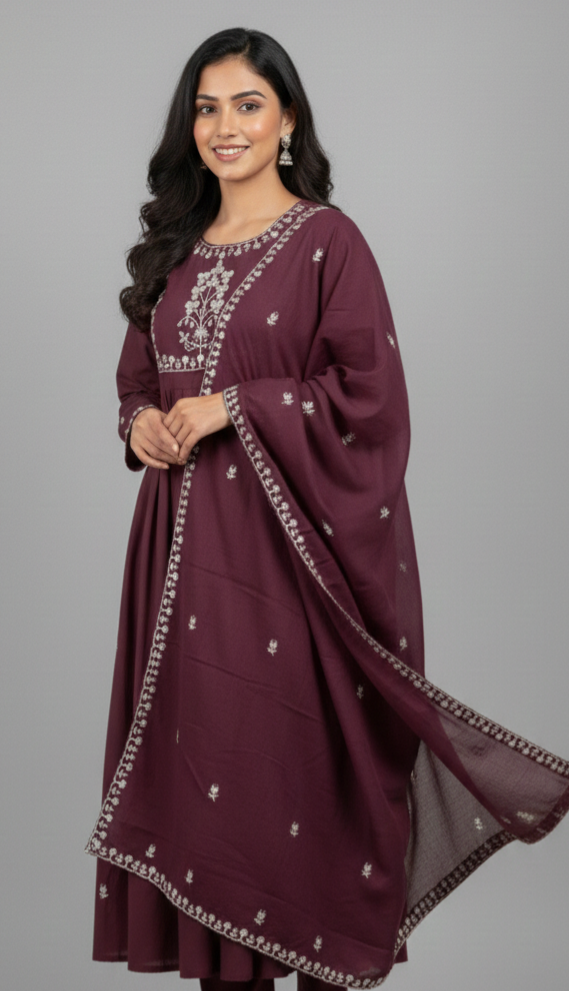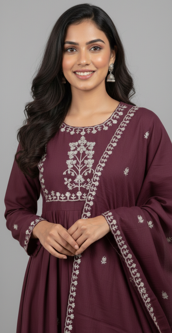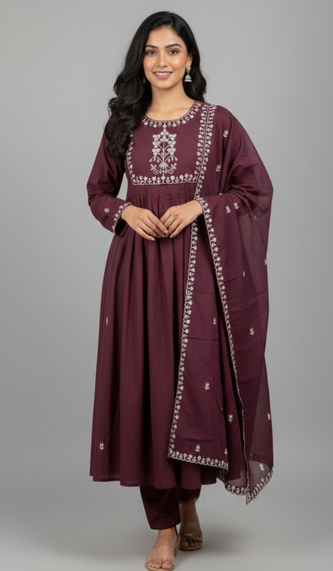 Elevate your ethnic wardrobe with this stunning 3-piece Anarkali set. Drenched in a rich, deep wine hue, this ensemble perfectly balances traditional silhouettes with contemporary detailing, making it an ideal choice for festive celebrations, weddings, or formal gatherings.