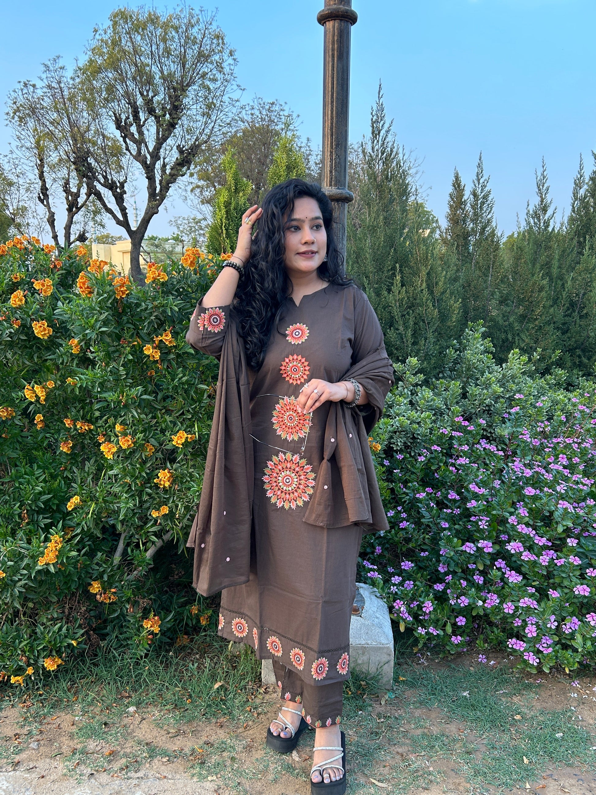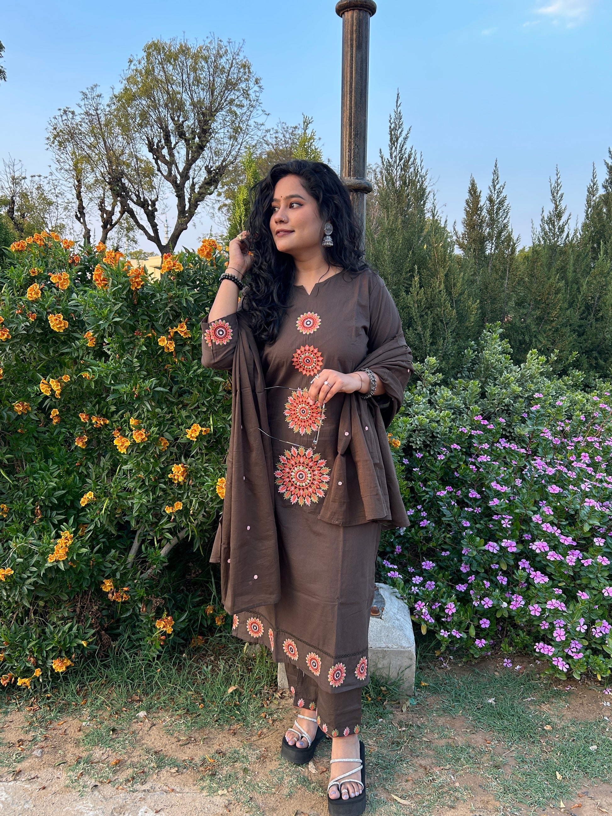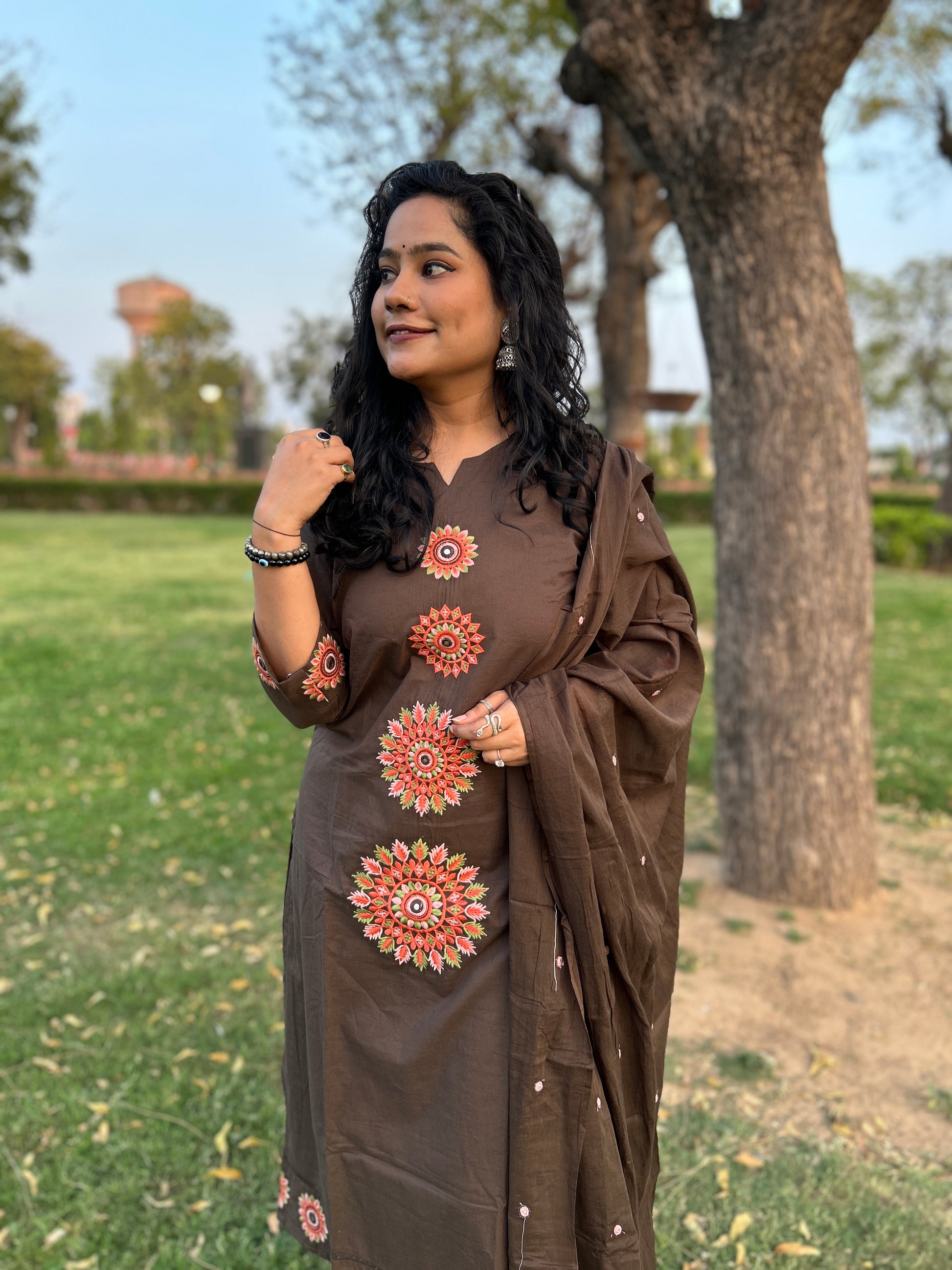 Pair this set with oxidized gold earrings and beaded Juttis as shown in the images to lean into the bohemian-ethnic vibe. A stack of wooden or metallic bangles will perfectly complement the embroidered cuffs.