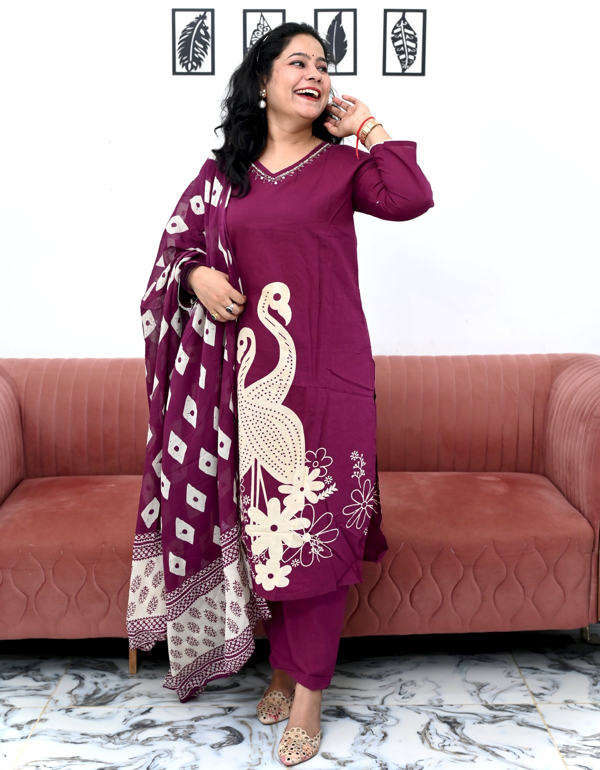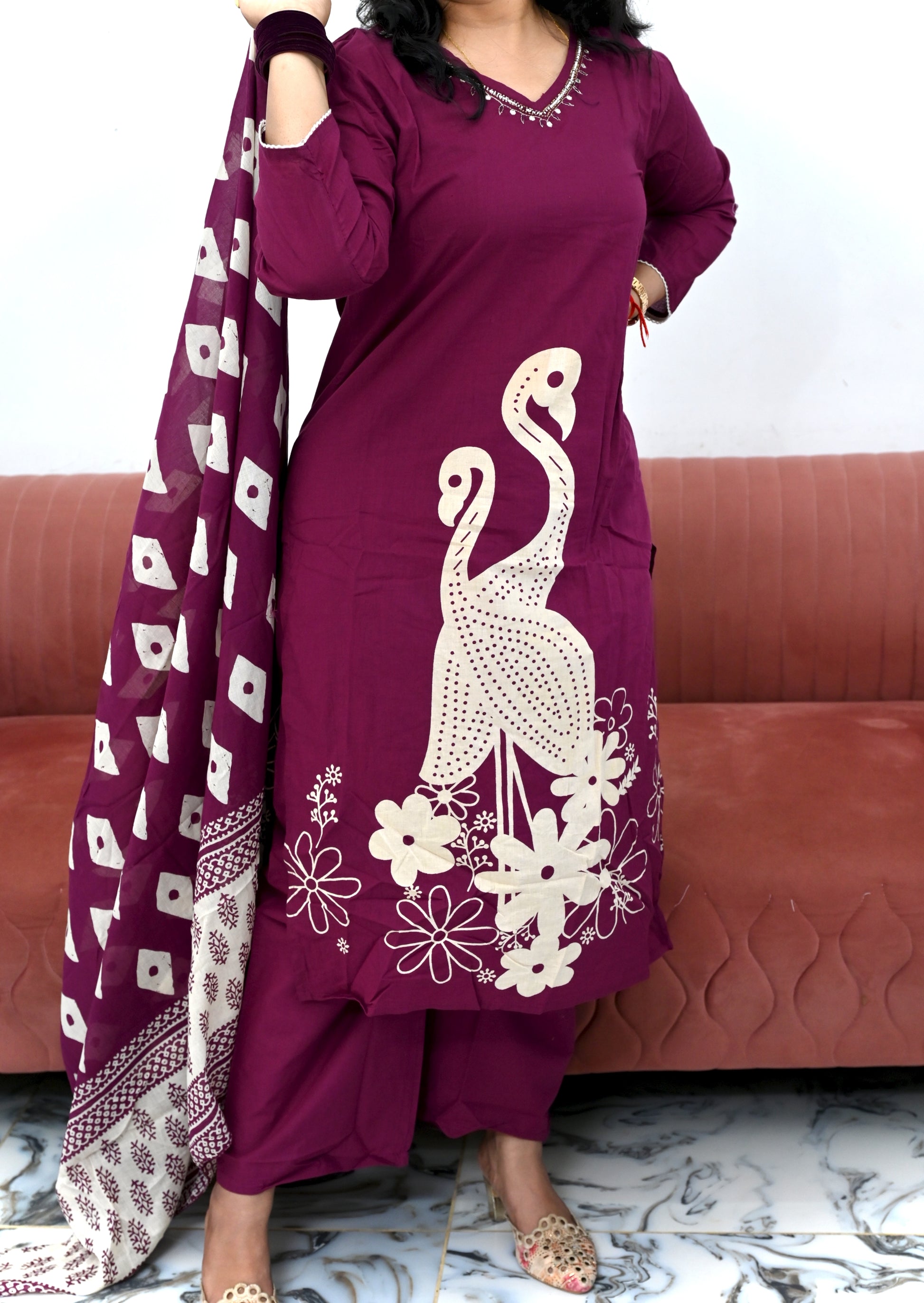 The Wine Swan Embroidered Suit Set is a charming and unique straight-cut suit set featuring playful applique and embroidery against a rich wine base, contrasted by an eye-catching dupatta.