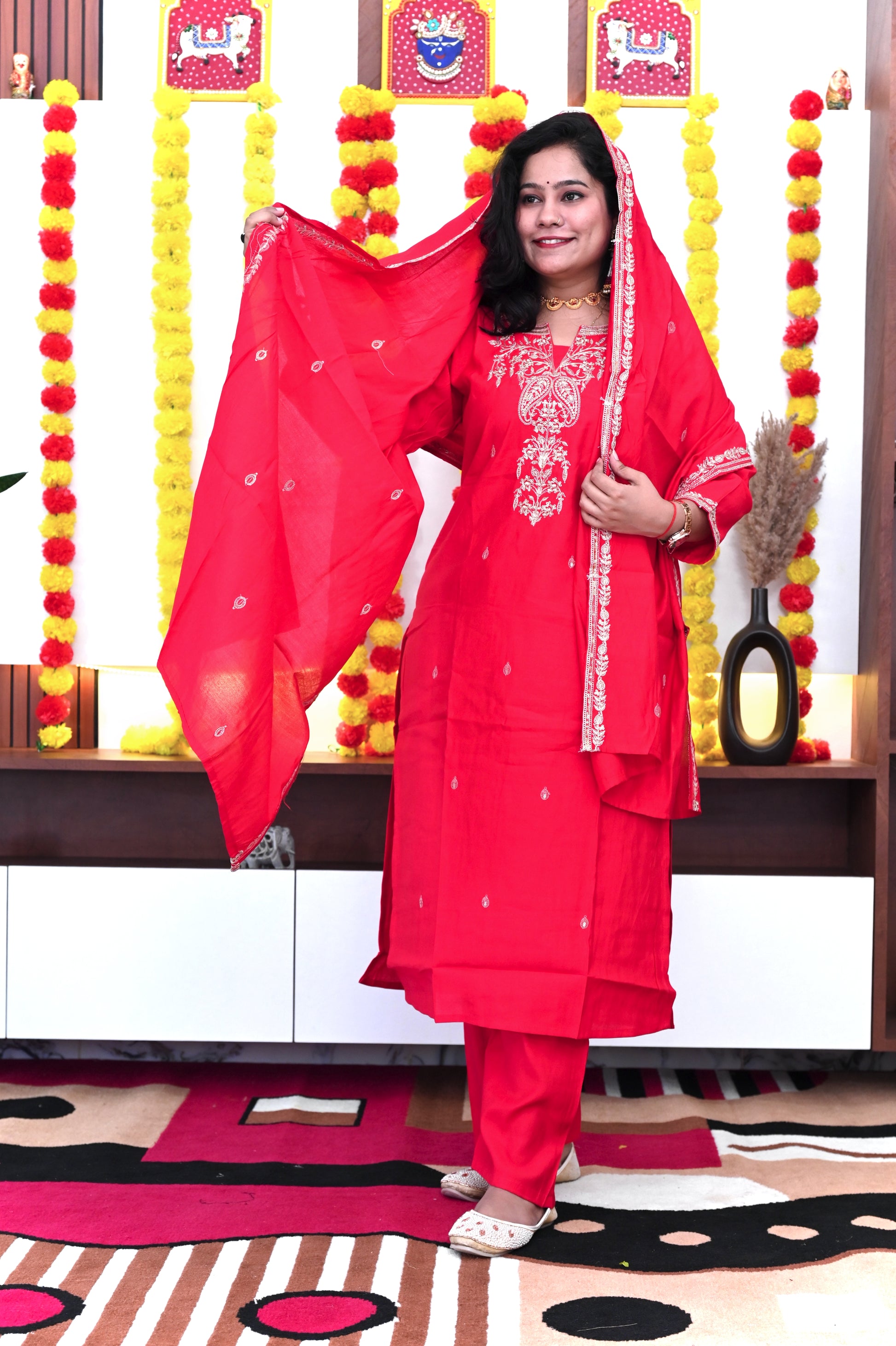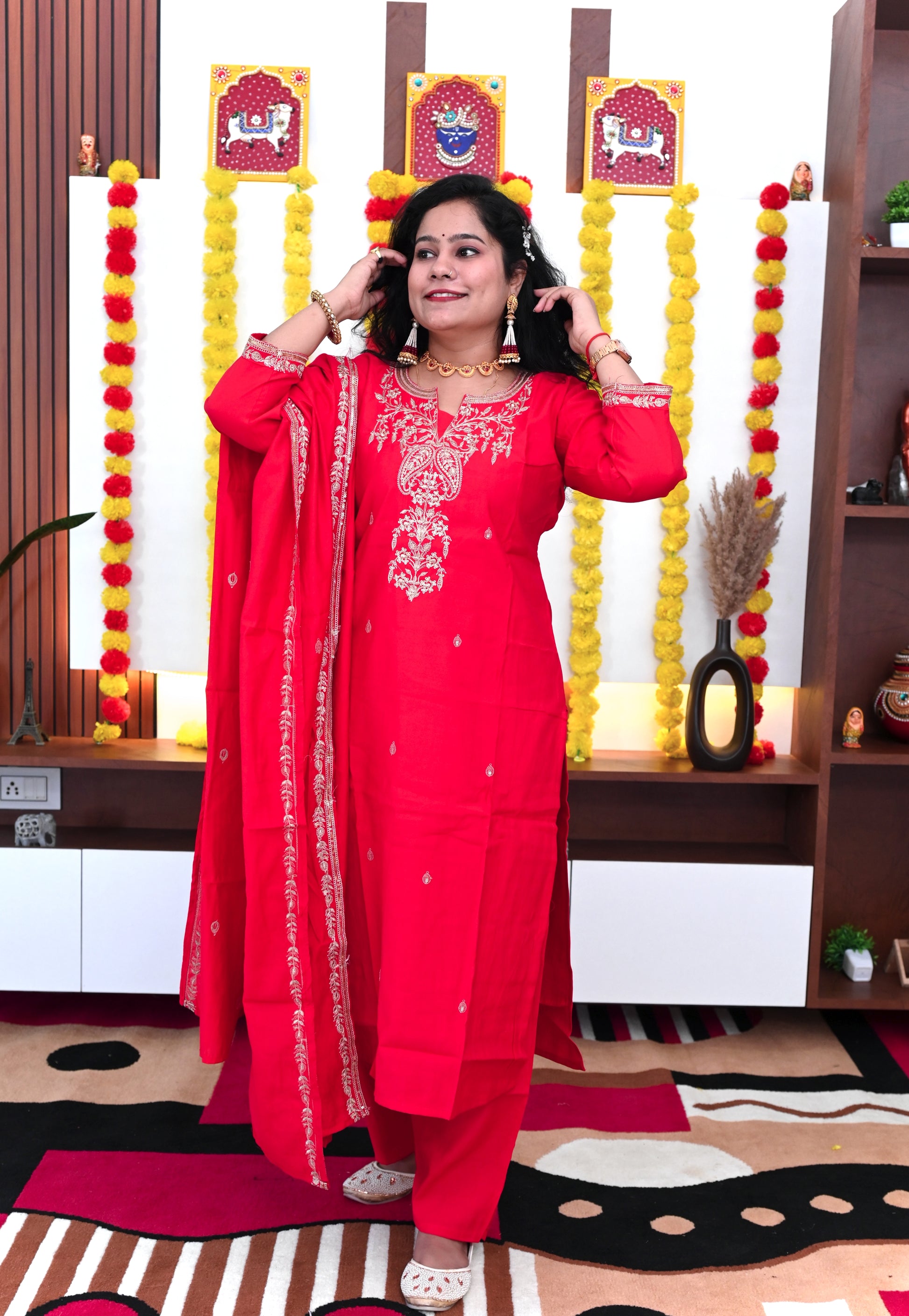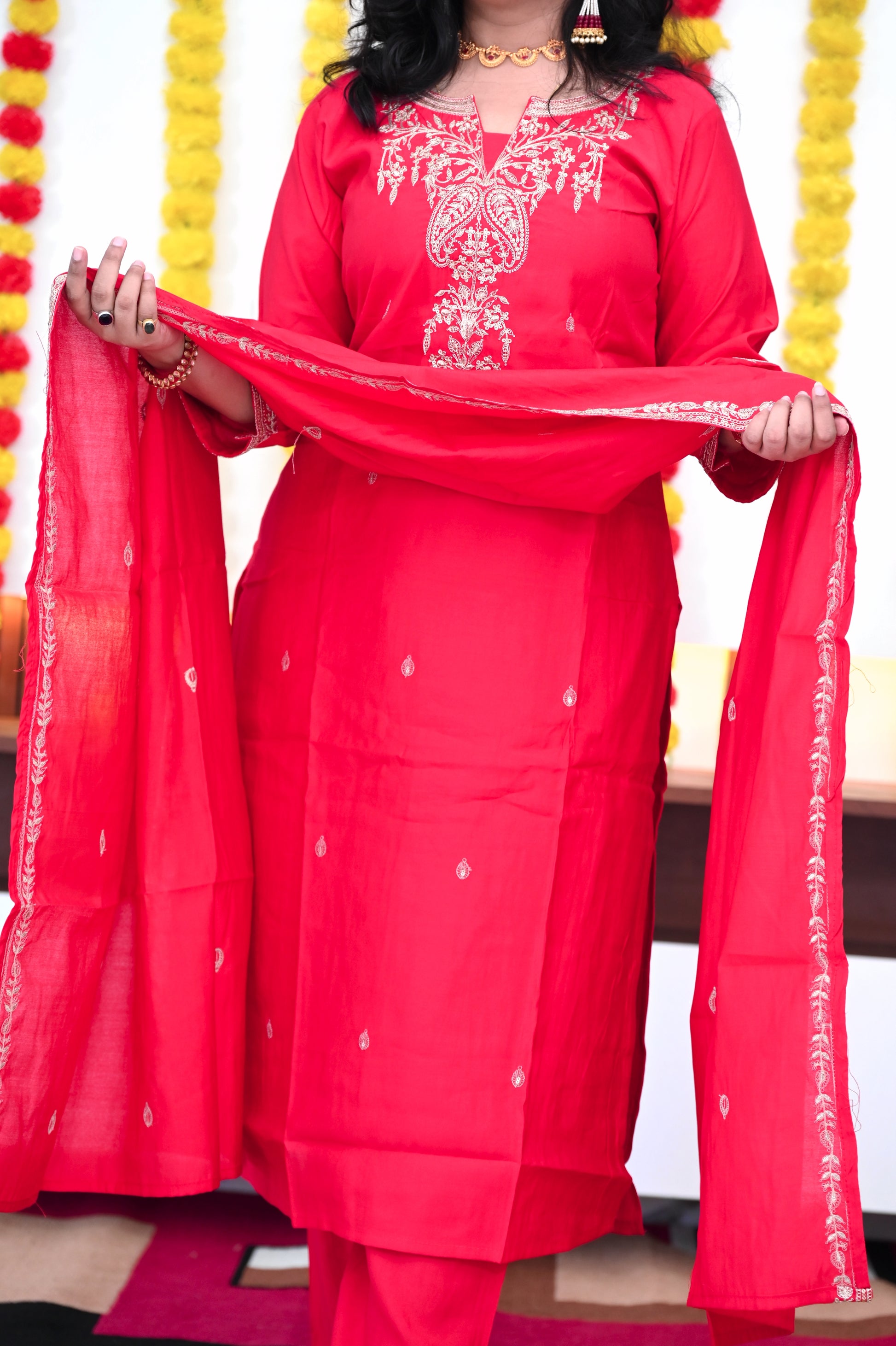 The Scarlet Soiree Embroidered Suit Set is a vibrant and classic straight-cut suit set featuring elegant white embroidery against a rich red base, perfect for festive and celebratory occasions.