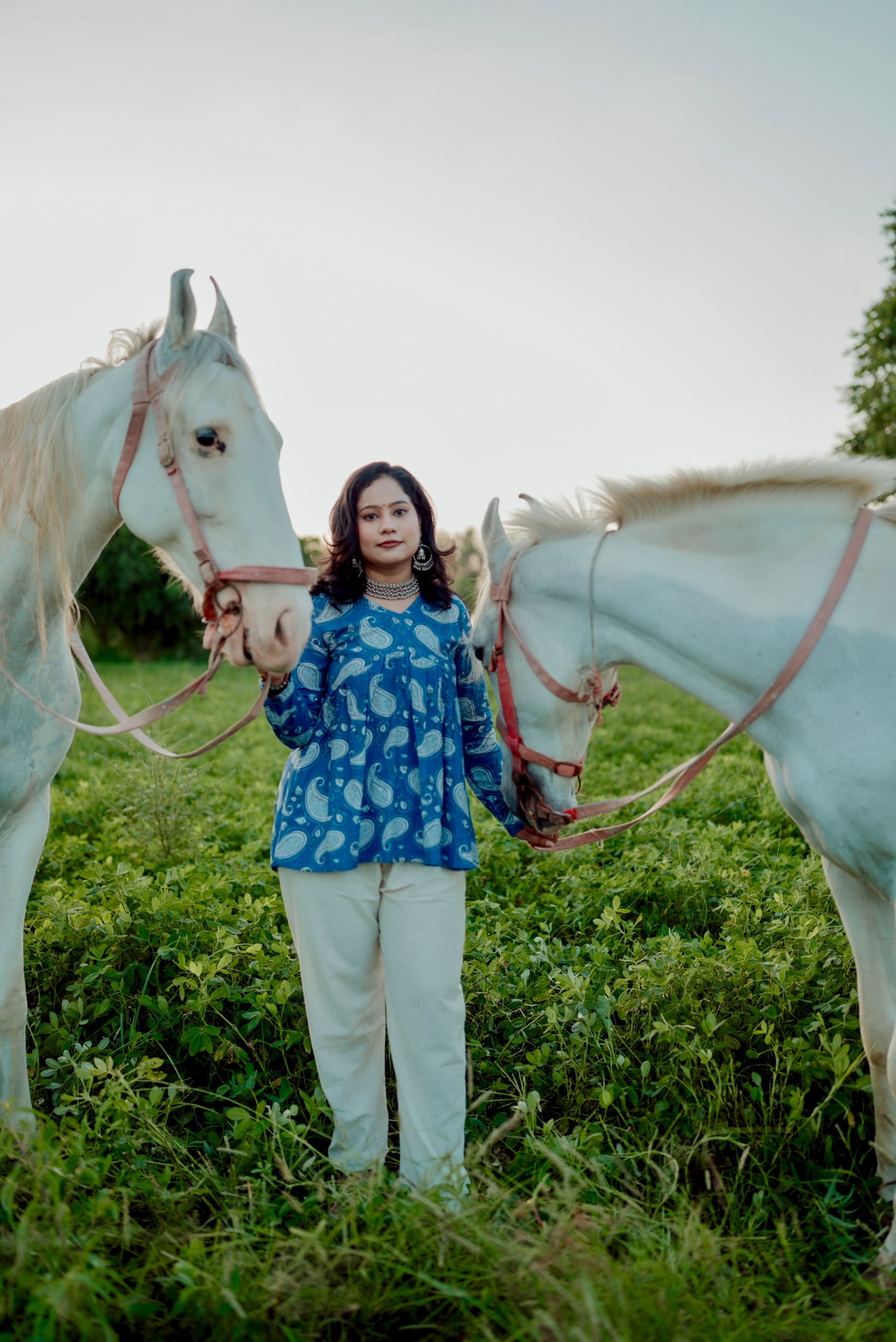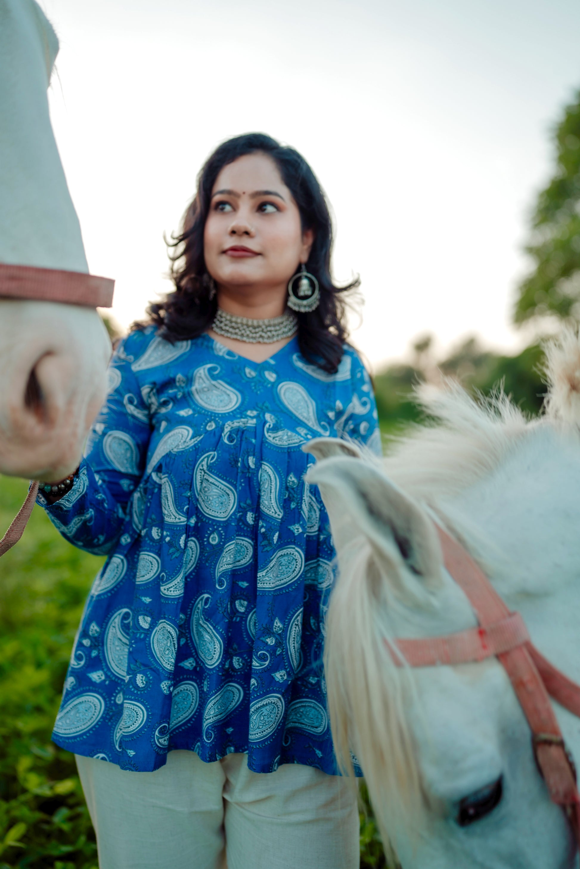 The Indigo Paisley Peplum Top Set is a chic and contemporary short kurta/peplum top in a stunning blue print, offering a fusion of traditional design and modern silhouette.