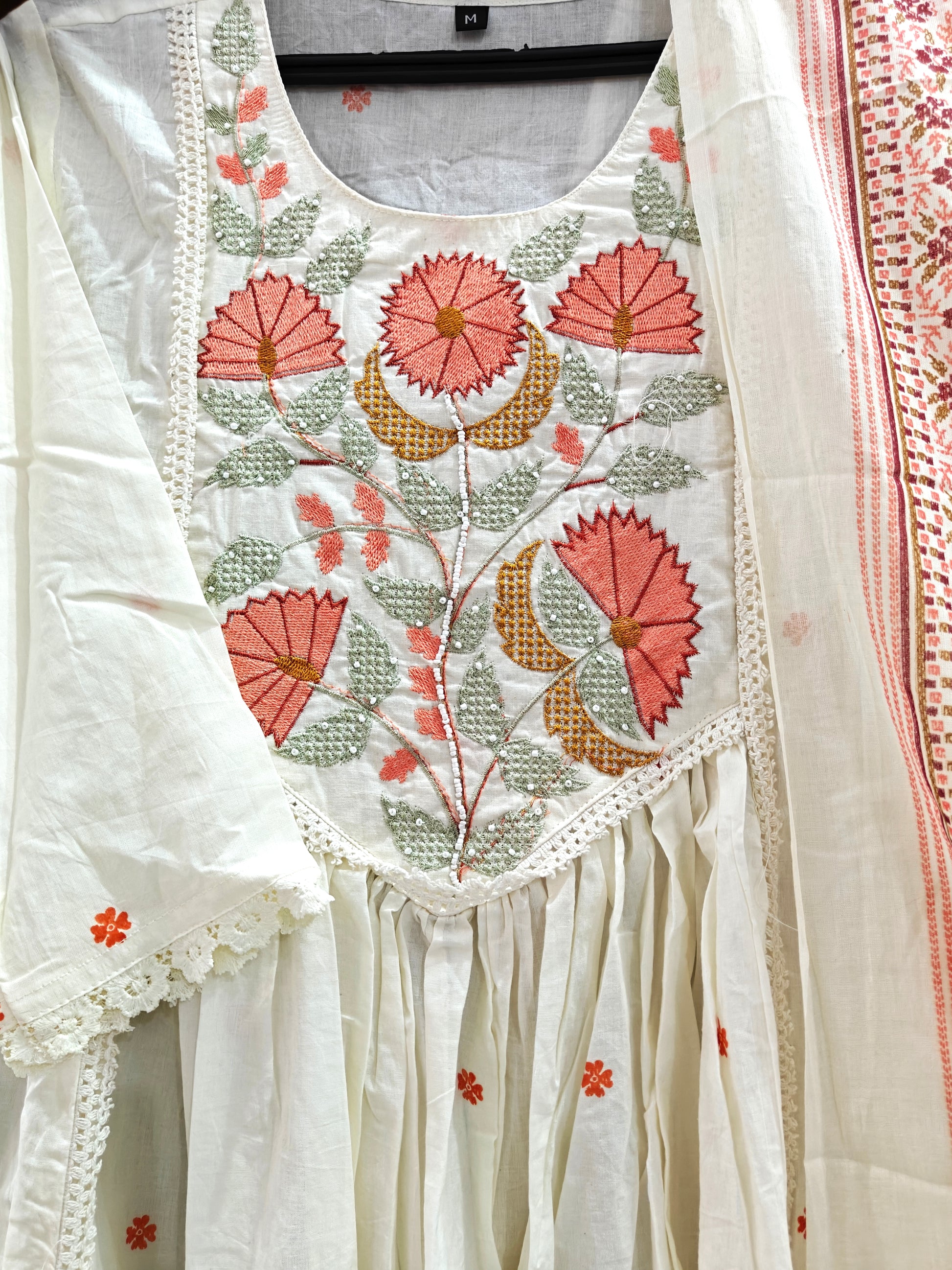 | Work | Heavy Multi-Color Thread Embroidery (Peach, Green, Gold) and Sequins on the yoke in a bold floral and foliage motif. Tiny scattered floral motifs on the skirt. |