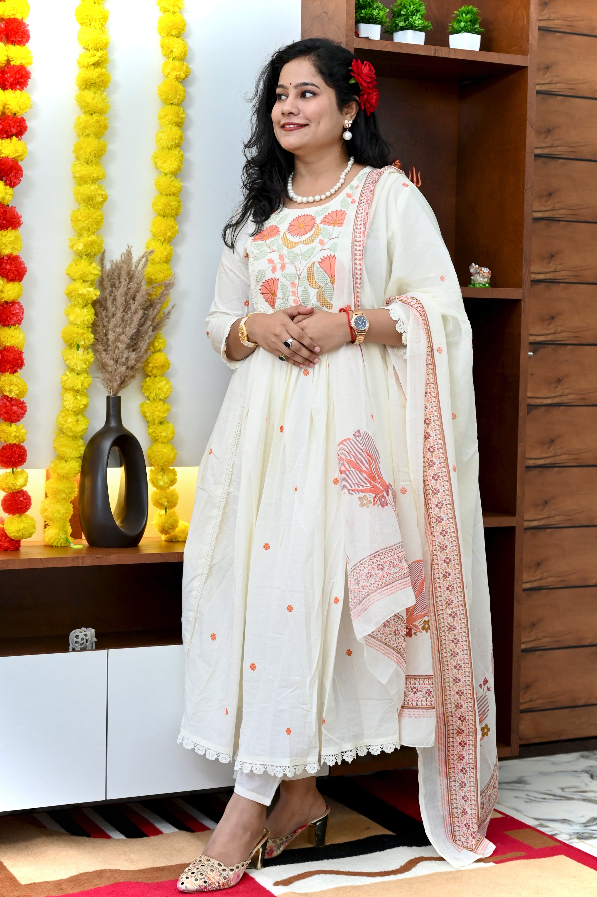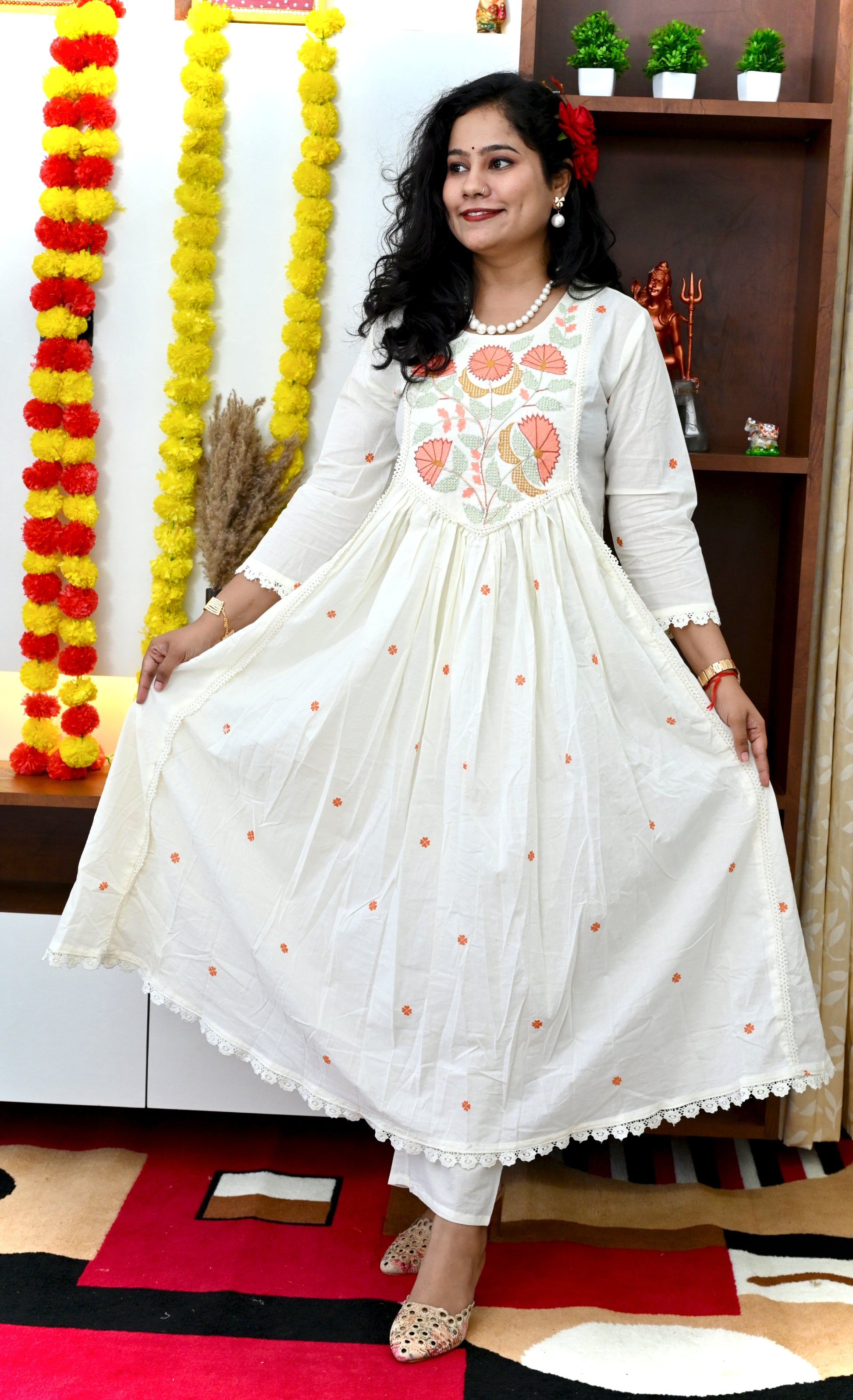 The Ivory Summer Bloom Flared Set is a charming and sophisticated in a pristine ivory shade, featuring intricate multi-color embroidery and delicate lace details, perfect for spring festivals and summer occasions.