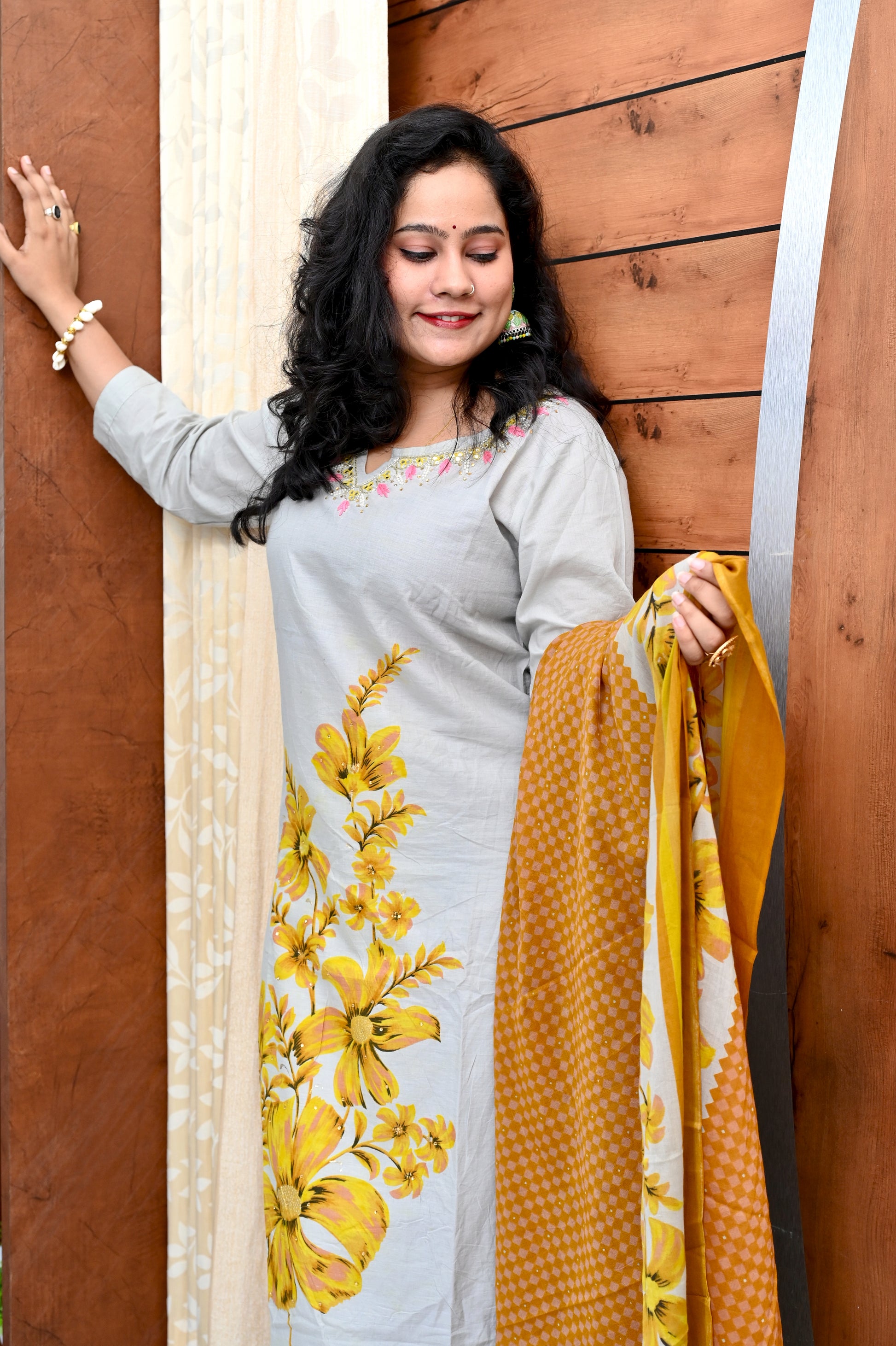 The Sunflower Serenity Kurta Set is a beautiful and contemporary straight-cut suit set featuring a subtle grey base highlighted by vibrant, hand-painted floral motifs and a rich, printed dupatta.